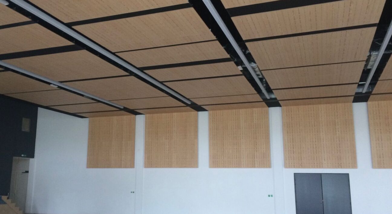 Salle des fêtes Théodore Gérard à DECIZE. Traitement acoustique panneaux bois OBERFLEX plafond et murs